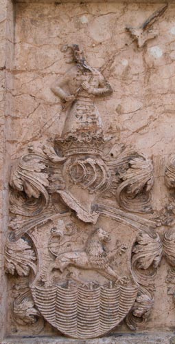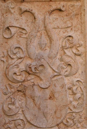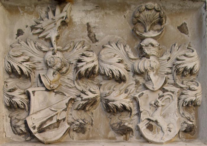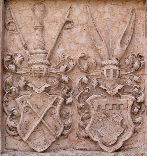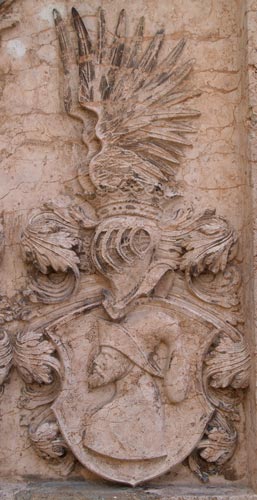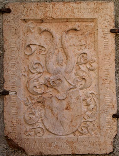 Die letzte hier vorgestellte Platte zeigt optisch links das Wappen der Ridler von Johanneskirchen (und Pfangau). Das Stammwappen - wie hier dargestellt - ist in Rot ein silberner Schrägrechtsbalken (hier gewendet), belegt mit einem schwarzen Strahl (= Pfeil). Auf dem Helm mit rot-silbernen Decken auf einem goldenen Vogelfuß ein wie der Schild bez. Flügel. 1586 und 1595 haben die Ridler in beiden Linien das Wappen der ausgestorbenen Kaindorfer dem ihrigen hinzugefügt. Das nun gevierte Wappen zeigt in den Feldern 1 und 4 das Ridlersche Stammwappen, in den Feldern 2 und 3 in gold-rot gespaltenem Feld einen dürren Baum, an dem ein Hifthorn hängt, dazu werden zwei gekrönte Helme geführt, Helm1 (vorne) ist der Ridler-Stammhelm, Helm 2 (hinten) ist der Kaindorfer Helm, ein dürrer Baum, an dem ein Hifthorn hängt, dazu rot-goldene Decken. Hier am Grabdenkmal ist nur das Stammwappen abgebildet. Das Geschlecht ist mit Franz Ignatius Ridler von Johanneskirchen, Pfangau und Obing um 1780 erloschen. Der gleiche Schild (in Rot ein silberner Schrägrechtsbalken (hier gewendet), belegt mit einem schwarzen Strahl (= Pfeil)) wird übrigens noch von den Ligsalz von Ascholding (Münchner Patriziergeschlecht) und von den Schrenk geführt, die Kleinode sind aber verschieden. Die Legende sagt, daß ein Schrenk, mit dem das Geschlecht ausstarb, nur zwei Töchter hatte. Er gab sie einem Ligsalz und einem Ridler zur Frau mit der Vereinbarung, daß diese seinen Wappenschild nehmen, die Helmzier aber abwandeln. So führen die Ligsalz einen roten Hut mit silbernem Stulp, darauf der schwarze Strahl, Decken rot-silbern, und die Ridler führen den mit dem Schildbild belegten Flügel mit Geierfuß. Die Ligsalz führten auch ein mit dem Hut bekleidetes rotes Mannsbild als Kleinod. Die Ligsalz hatten drei Linien, die von Hueb, die von Ascholding und die von Farchach. Die Linie von Hueb hat immer das einfache Stammwappen beibehalten, nur den Hut oben gekrönt und mit einem Hahnenfederbusch besteckt. Die Linie von Farchach führte später ein geviertes Wappen und als Helmzier den mit dem Hut bekleideten Mannsrumpf. Die Linie von Ascholding führte später einen mit dem Wappen Pötschner gevierten Schild. Wie es die Ironie des Schicksals wollte - unerwartet wurde dem alten Schrenk doch noch ein Sohn geboren, und seine Familie überlebte die beiden anderen und blüht noch, als die beiden anderen längst ausgestorben waren (Ligsalz 1739, Ridler um 1780). Soweit die Legende. Der Vater der hier bestatteten Töchter war übrigens Sebastian Ridler, "D.O.M. Hie ligen begraben des Edlen und Vesten Sebastian Ridler zu Johanskhirchen .... in Bayern Rath und Chastner (Kastner) zu Burckhausen leibliche Khinder....".