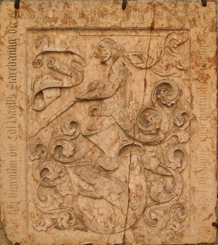 Dieser auf 1509 datierte Stein für Ludwig von Walbrunn zeigt das Wappen der Familie Walbrunn (auch Wallbrunn), in Blau drei (2:1) silberne Rauten (Wecken). Auf dem Helm mit blau-silbernen Decken eine silberne Raute zwischen zwei blauen Büffelhörnern, deren jedes mit einer silbernen Raute belegt ist. Alle Rauten sind hier facettiert dargestellt. Die Familie Walbrunn (auch Wallbrunn) ist ein reichsritterschaftliches Geschlecht, rheinischer Uradel, das im Rheinland, in Schwaben, in Böhmen, in Württemberg und in Hessen zu finden ist. Stammsitz ist Partenheim bei Mainz. Böhmischer Freiherrenstand für Georg Christoph von Walbrunn, sachsen-lauenburgischer und später großherzoglich-toskanischer Hofmeister und Oberschenk, am 16.7.1724, Ausdehnung auf die gesamte Familie 1726. Sie besaßen seit 1440 Ernsthofen (bei Dieburg, Gemeinde Modautal) als pfälzisches, ab 1522 als hessisches Lehen bis 1722, wo sie es dem Lehnsherrn verkauften. In der Schloßkapelle Ernsthofen haben sie ihr Erbbegräbnis. Sie standen in Diensten der Katzenelnbogener und später der hessischen Landesherren. Diese Familie ist maßgeblich für die Verwüstung der Stadt Friedberg im Jahre 1444 mitverantwortlich. Die Inschrift der Platte lautet: "Hie ligt begraben Chonnem von Walbrunn Zw Newen Egloshaim disser Zeit haubtmann Zw Burckhausen [Sun] Ludbig genant dem got genad An(n)o d(omini) 1509".