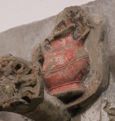 Dieses Wappen für den Fürstbischof Johann III. von Grumbach (1455-1466) finden wir im Würzburger Kiliansdom an der südlichen Wand des südlichen Seitenschiffs, ohne weiteren Kontext dort eingemauert, in der Nähe eines sehr ähnlichen Wappens für Rudolf von Scherenberg.