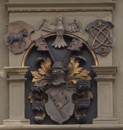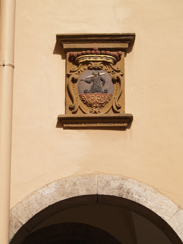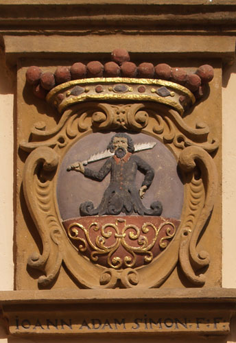 Außen am Gebäude sind insgesamt drei Wappensteine angebracht. Der erste ist bezeichnet mit "IOANN ADAM SIMON F(IERI) F(ECIT); sein Wappen ist erniedrigt geteilt, oben die Dreiviertelfigur eines bärtigen, schwarz mit roten Aufschlägen und Knöpfen gekleideten Mannes (in der gegenwärtigen Farbfassung), der eine silberne Zimmermannssäge schultert, die Linke ist eingestemmt, unten damasziert (ohne Literaturbeleg, Tinkturen ohne Beleg). Vermutlich handelt es sich bei diesem bürgerlichen Wappen des Johann Adam Simon um einen Hinweis auf den Beruf des Inhabers.