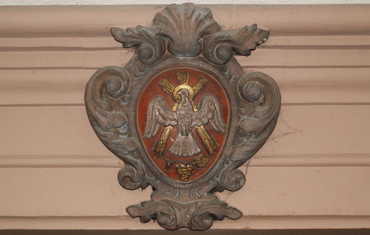 Das zweite Wappen ist auf einem Portalsturz angebracht und zeigt das Stiftswappen, die Taube des Heiligen Geistes, silbern auf rotem Grund, golden nimbiert, vom Nimbus radial mehrere goldene Strahlen ausgehend, und unten von einer Weintraube an einem Rebenstück mit Blatt begleitet. In diesem Wappen ist die Dualität der Stiftung enthalten, das caritative Engagement als Spital und zugleich einer der wichtigsten Weinbaubetriebe der Stadt, der nach wie vor seine Kelterei mitten in der Stadt betreibt und den größten Holzfaßkeller in Deutschland sein eigen nennt.