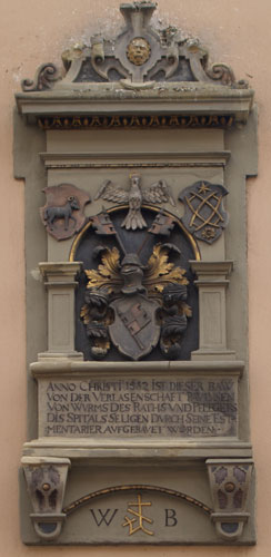 Der dritte Wappenstein trägt die Inschrift "ANNO CHRISTI 1582 IST DIESER BAW / VON DER VERLAS(S)ENSCHAFT PAVLVSEN / VON WVRMS DES RATHS VND PFLEGERS / DI(E)S(ES) SPITALS SELIGEN DVRCH SEINE TESTA/MENTARIER AVFGEBAVET WORDEN". Im zentralen Bogenfeld ist das Wappen der Stadt Würzburg angebracht, eine der seltenen Darstellungen als Vollwappen: In Schwarz eine schräggestellte und an den beiden senkrechten Seiten je zweimal eingekerbte rot-golden gevierte Standarte mit silbernem Schaft, auf dem Helm mit schwarz-goldenen Decken auf einem Turnierhut zwei Standarten wie im Schild schräg nach auswärts wehend. Über dem Stadtwappen ist die silberne Taube des Heiligen Geistes angebracht. In den beiden Bogenzwickeln sind zwei weitere Schilde angebracht, der heraldisch rechts mit dem schreitenden Widder verweist auf den Gründer, Johannes von Steren. Der andere Schild zeigt in Schwarz (Feld ist korrekterweise blau) zwei goldene, schräggekreuzte und miteinander verschränkte Faßleitern, begleitet oben von einem goldenen sechszackigen Stern und unten von einer goldenen Rose (der Erblasser Paul von Worms). Unten trägt der Stein zwischen den beiden Konsolen ein Steinmetzzeichen im Renaissance-Stil zwischen den Initialen WB. Oben wird der Stein durch ein Eierstabgesims abgeschlossen; im bekrönenden Aufsatz trägt das Beschlagwerk in der Mitte eine Löwenmaske.