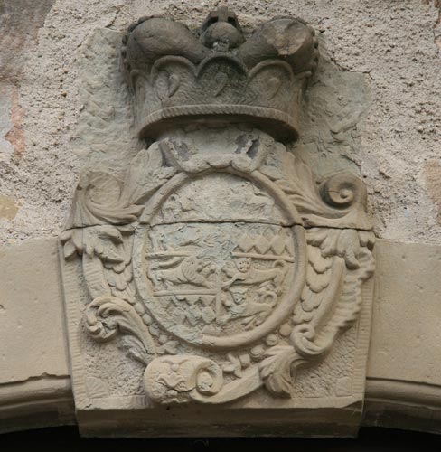 Abb.: Einzelnes Hohenlohe-Wappen an der Westseite des Marstalls. Bestes Photolicht am Nachmittag.