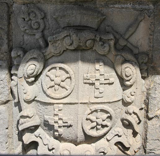 Als Oberwappen findet man den Kurhut sowie Krummstab schrägrechts und Schwert schräglinks hinter dem Schild. Ein weiteres bauplastisches Wappenbeispiel dieses Kurfürsten läßt sich übrigens an der erzbischöflichen Burg in Eltville finden.