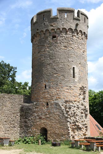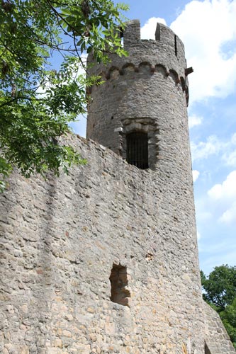 Die heute in der Mitte "leere" Anlage läßt einen echten Bergfried vermissen, der einst in der Mitte des Hofes stand, von quadratischem Querschnitt war, in Bezug auf das Rechteck der Mauern übereck gestellt war, ca. 30 m Höhe bei schlanken, knappen 8 m Seitenlänge erreichte und 1768 durch einen Blitzeinschlag schwer beschädigt worden war, so daß er 1924 wegen gefährlichen Bauzustandes gesprengt und abgerissen wurde. Statt dessen sehen wir in der Nordwestecke der Burg, wo sich früher der Hauptwohnbau und eine Kapelle befanden, eine völlig unhistorische und den historischen Befund verfälschende Lösung aus dem frühen 20 Jh.; hier hat man 1927-30 aus altem Material und unter Verwendung romanischer und sonstiger Spolien einen neuen Phantasiebergfried errichtet, der nie so existierte und gar nicht zu der Anlage paßt, nun aber leider die Ansicht der Burg von Westen dominiert. Insbesondere gingen die mittige Position und der übereckgestellte Grundriß, wie man ihn auch beim anderen Odenwaldburgen wie der Wildenburg findet, verloren. Man pfiff damals auf historische Treue und Authentizität und wollte lieber eine große Freifläche im Burghof für Veranstaltungen haben. Nördlich und östlich dieser denkmalpflegerischen Sünde schließen sich die modernen Bauten der Jugendherberge aus den Jahren 1958-60 an.