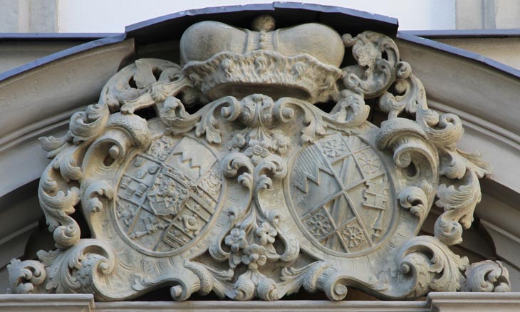 Das Wappen von Johann Philipp Franz von Schönborn (reg. 1719-1724) ist im Detail wie folgt aufgebaut: Feld 1: in Gold ein schwarzer Doppeladler, oben begleitet von einer goldenen Krone, kaiserlicher Doppeladler, Feld 2: "Fränkischer Rechen" = von Rot und Silber mit drei aufsteigenden Spitzen geteilt, für das Herzogtum zu Franken, Feld 3: Erzherzogtum Österreich auf einem kleinen Schild: in Rot ein silberner Balken, Feld 4: geteilt, oben in Rot drei (2:1) silberne Schildchen, reichsständische Herrschaft Reichelsberg, unten in Schwarz 3 (2:1) goldene aufrechte Getreidegarben, von Buchheim, Feld 6: geteilt, oben in Blau ein silberner Balken, begleitet von 3 (2:1) silbernen Rauten, Herrschaft Heppenheim, unten in Hermelin auf einem roten und mit goldenen Troddeln verzierten Kissen ein goldener Reichsapfel mit goldenem Kreuz, Erbtruchsessen-Amt in den österreichischen Landen ob und unter der Enns, Feld 7: in Gold ein schwarzer Wolf, Grafen von Wolfsthal, Feld 8: "Rennfähnlein" = in Blau eine rot-silbern gevierte, schräggestellte und an den beiden senkrechten Seiten je zweimal eingekerbte Standarte mit goldenem Schaft, für das Hochstift Würzburg, Feld 9: in Silber ein blauer Löwe, belegt mit zwei roten Balken, Truchseß von Pommersfelden, gekrönter Herzschild: in Rot auf drei silbernen Spitzen ein schreitender, goldener, gekrönter Löwe, Stammwappen der Grafen von Schönborn.