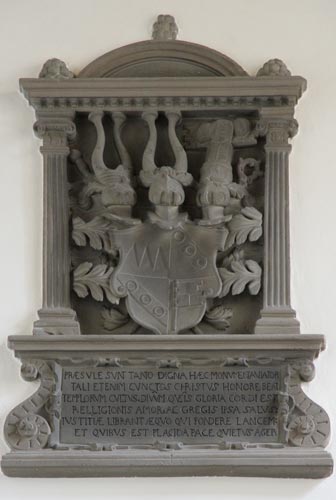 In dieser Kirche finden wir innen sogar zweimal den Wappenschild des Würzburger Fürstbischofs Julius Echter von Mespelbrunn (reg. 1573-1617). Neben der erwähnten Bautafel (Abb. oben) ist ein zweites Wappen oben am Orgelgehäuse angebracht (ohne Abb.). Das Wappen ist geviert: Feld 1: "Fränkischer Rechen" = von Rot und Silber mit drei aufsteigenden Spitzen geteilt, für das Herzogtum zu Franken, Feld 2 und 3: in Blau ein silberner Schrägbalken, belegt mit drei blauen Ringen, Stammwappen der Echter von Mespelbrunn, Feld 4: "Rennfähnlein" = in Blau eine rot-silbern gevierte, an den beiden senkrechten Seiten je zweimal eingekerbte, schräggestellte Standarte mit goldenem Schaft, für das Hochstift Würzburg.