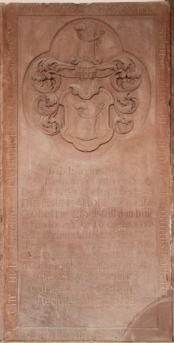 Diese Platte im Würzburger Domkreuzgang ist für den am 8.12.1716 geborenen und am 3.7.1735 im jugendlichen Alter von nicht einmal 18 Jahren verstorbenen Domherrn Philipp Otto Wilhelm Zobel von Giebelstadt. Er war am 3.7.1727 auf die Stelle des zuvor verstorbenen Anton Sebastian Graf von Hatzfeld gekommen. Philipp Otto Wilhelm Zobel von Giebelstadt starb einen für Kleriker ungewöhnlichen Tod, denn er hatte außerhalb der Stadt auf einem Schießübungsplatz ungeschickt mit seinem Gewehr hantiert und sich dabei so dämlich angestellt, daß er sich selber so verwundete, daß er fünf Tage später seinen Verletzungen erlag.