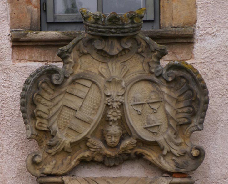 Heraldischen Schmuck finden wir oberhalb des mittig angeordneten Rundbogenportals, unter den Fenstern des Obergeschosses. Der undatierte Wappenstein in den Formen des Rokoko ist oberhalb einer breiten Konsole mit einem drapierten, dreilappigen Tuch angebracht. Zwischen zwei ovalen, einander zugeneigten Kartuschen ist als Trenner eine Dekoration aus geflügeltem Engelskopf, Blumengirlande und Muschelornament angebracht. Über beiden Kartuschen ist oben in der Mitte eine Laubkrone angebracht. Die heraldisch rechte Kartusche zeigt das Wappen der von Erthal, geviert, Feld 1 und 4: in Rot zwei silberne Balken, Feld 2 und 3: ledig und blau. Die hier nicht dargestellte Helmzier wäre zu rechts rot-silbernen und links blau-silbernen Decken ein Paar geteilter Büffelhörner, rechts oben rot mit zwei silbernen Balken, unten blau, rechts umgekehrt (Aschaffenburger Wappenbuch, Tafel 6 Seite 119, 124-126, Rahrbach, Schöler). Im Innern ist das Erthal-Wappen ein weiteres Mal im Stuck des Korridors des ersten Obergeschosses angebracht.