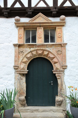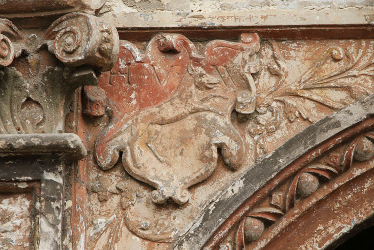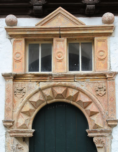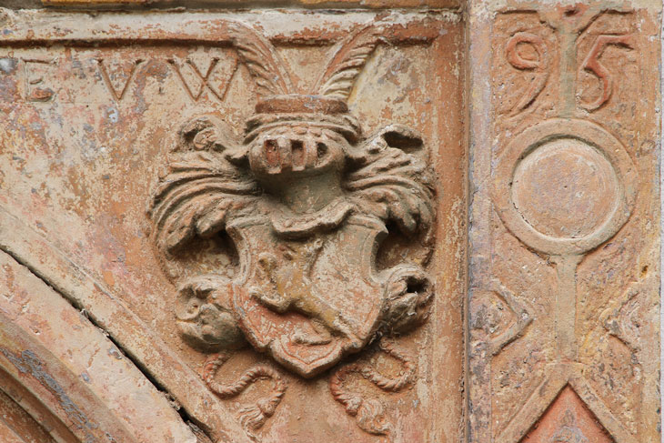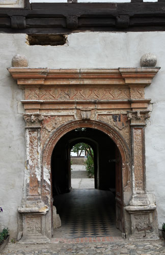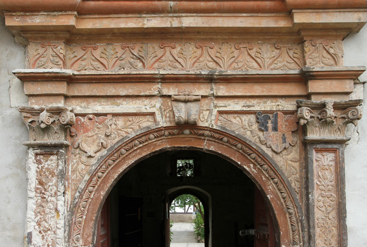 In diesen historischen Teil des Erdgeschosses führt ein schönes Sandsteinportal aus der Renaissance, mit einem Rundbogen zwischen kannelierten Flachpfeilern und Architrav, inschriftlich datiert auf das Jahr 1567. In den Zwickeln des Portals sind die Initialen und Wappen von "H. V. W." = Hans von Wulffen und seiner Frau "M - E. v. P." = M.-Elisabeth von Plotho angebracht. Das Wappen der von Wulffen zeigt einen aufspringenden Wolf. Die hier nicht dargestellte Helmzier wäre ein niedriger, runder, aufgekrempter Hut mit zwei Federn besteckt. Die Tinkturen sind nicht bekannt (Siebmacher Band: SaA Seite: 192 Tafel: 124, Band: AnhA Seite: 69-70 Tafel: 40). Die Familie besaß Radegast im Anhaltischen, hatte Besitzungen in den Stiftsländern von Quedlinburg und Halberstadt und ist im 17. Jh. erloschen. Mitglieder der Familie standen in magdeburgischen Diensten. Die Familie ist nicht zu verwechseln mit gleichnamigen Familien, die aber den Wolf wachsend als Kleinod führen.