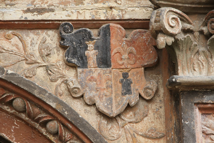 Das Wappen der von Plotho ist geviert, Feld 1 und 4: in Rot ein schwarzer, golden gekrönter Mohrenrumpf, Feld 2 und 3: in Silber eine rote Lilie mit goldenem Bund. Dieses Wappen wird meistens mit einer Kombinationshelmzier geführt, auf dem Helm mit rot-silbernen Decken eine rote Lilie mit goldenem Bund zwischen zwei nach außen gelehnten Mohrenrümpfen (Siebmacher Band: Pr Seite: 57 Tafel: 73-74, Band: PrA Seite: 61 Tafel: 45, Band: PrGfN Seite: 17 Tafel: 12, Band: AnhA Seite: 83 Tafel: 49, Münchener Kalender 1916). Die Reste der vorgefundenen Farbfassung sind erratisch. Der Stammsitz Alten-Plathow liegt im Jerichower Land und war 1294 an das Erzstift Magdeburg gefallen. Die Herren von Plotho waren Ministerialen der Erzbischöfe von Magdeburg und traten in Lehensverhältnisse mit den Markgrafen von Brandenburg. Wolfgang Edler v. P. erhielt vom Kaiser zu Wien am 13.9.1643 unter Bestätigung des alten Herrenstandes den Reichsfreiherrenstand mit dem Prädikat "Frhr. v. Engelmünster auf Parey und Wilszsandt". Engelmünster war eine flämische Baronie. 1840 bekam die Familie das Amt eines Erbkämmerers im Herzogtum Magdeburg.