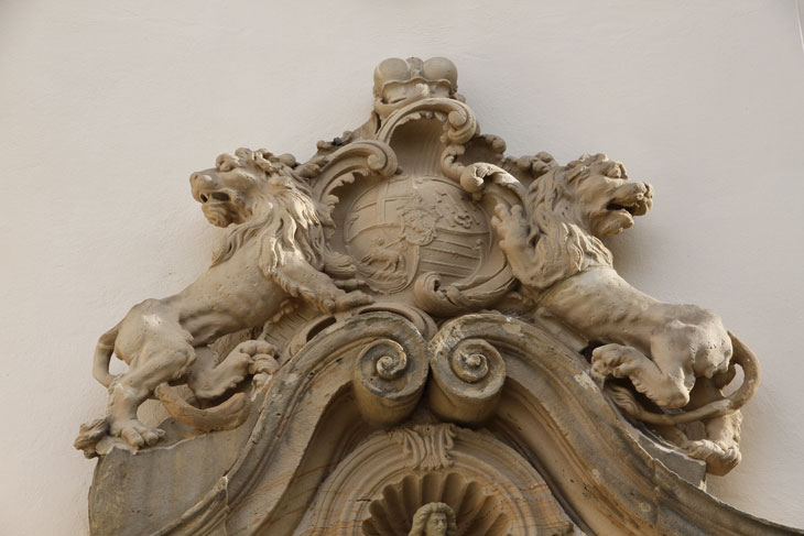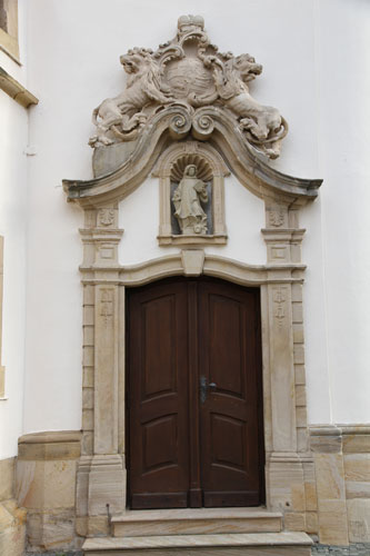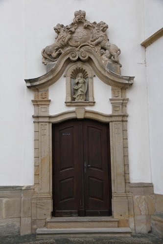 Über den beiden Portalen der Seitenflächen der Westfassade ist jeweils ein Wappen des Bauherrn angebracht, das von Fürstbischof Johann Philipp von Walderdorff (reg. 1763-1768). Er hatte zwei Bistümer inne, 1758-1768 Trier, und 1763-1768 Worms. Seine Wappen als Fürstbischof von Worms enthalten folglich immer beide Bistümer. Im Detail ist sein Schild geviert mit Herzschild, Feld 1: in Silber ein rotes, durchgehendes Kreuz, Fürsterzbistum bzw. Kurfürstentum Trier, Feld 2: im schwarzen, mit 8 (2x 4) goldenen Schindeln belegten Feld ein schräg aufwärts gerichteter silberner Schlüssel, Fürstbistum Worms, Feld 3: in Rot auf grünem Grund ein silbernes, zurückschauendes, golden nimbiertes Lamm, das ein silbernes Fähnchen mit rotem Kreuz trägt, sog. Prümer Lamm, Fürstabtei Prüm, Feld 4: in Silber zwei rote Balken, Herrschaft und Grafschaft Niederisenburg, Herzschild: in Schwarz ein rot-silbern geteilter doppelschwänziger Löwe, golden gekrönt, über dem Herzschild eine goldene Laubkrone, Stammwappen der Familie von Walderdorff. Über der Rocaille-Rahmung der Kartusche ist ein Kurhut dargestellt. Das Wappen wird von zwei widersehenden Löwen gehalten. Die beiden Portale sind fast gleich und unterscheiden sich nur in der Figurennische zwischen dem Türsturz und den beiden zur Mitte hin hochschwingenden Hälften des Gebälks, über deren schneckenförmig eingerollten mittleren Enden das Wappen angebracht ist. In der südlichen Figurennische sehen wir den hl. Cyriakus, in der nördlichen eine Maria Dolorosa. Über dem Portal befindet sich jeweils ein flaches Ovalfenster, das aber blind ist.