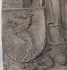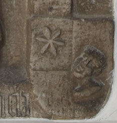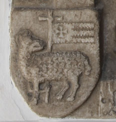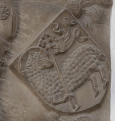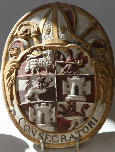 Schrägrechts ragt hinter dem Wappen der Krummstab empor, schräglinks hat das gestürzte Schwert seinen Platz, zu sehen in einer farbig gefaßten, mit "CONSECRATORI" bezeichneten ovalen Plakette an der Wand in nächster Nähe, die inhaltlich dem Wappen auf der Grabplatte entspricht. Eine zweite, ganz gleich gestaltete Plakette mit dem Schriftzug "PERPETVO PRAEPOSITO" trägt das Wappen des Hochstifts Brixen noch einmal einzeln.