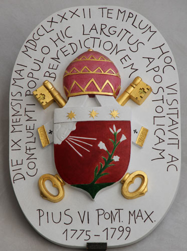 Der einer alten Adelsfamilie entstammende Pius VI. hatte mit 24 Jahren Dauer eines der längsten Pontifikate der Geschichte. Ebenfalls rekordverdächtig waren die Umstände seiner Wahl: Das Konklave dauerte fast 5 Monate. Diese Tafel erinnert an seinen Besuch im Jahre 1782: "DIE IX MENSIS MAI MDCCLXXXII TEMPLUM HOC VISITAVIT AC / CONFLUENTI POPULO HIC LARGITUS APOSTOLICAM / BENEDICTIONEM / PIUS VI: PONT(IFEX) MAX(IMUS) 1775-1799". Das Papstwappen ist hier mit zwei schräggekreuzten goldenen Schlüsseln unterlegt, richtiger wäre ein goldener und ein silberner. Ein riesiges Wappen dieses Papstes ist an der Decke der Lateranbasilika in Rom angebracht, dort sind auch beide Schlüssel golden, das liegt aber daran, daß das komplette Beiwerk vergoldet wurde. Ein weiteres Wappen dieses Papstes ist im Palazzo Braschi in Rom über einer Tür zu einem Appartement des zweiten Stockwerks angebracht. Und im Palazzo Trivulzio in Mailand ist es ebenfalls angebracht.