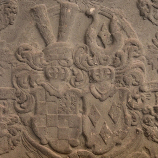 Diese im unteren Teil stark verwitterte Grabplatte hat eine lange und wechselhafte Geschichte. Erst wurde sie für den Ober-Ingelheimer Schultheißen Michael Haberkorn von Zellingen (-1527) angefertigt, dann wurde sie umgedreht und noch einmal auf der anderen Seite behauen, diesmal als Grabplatte für Anna Catharina von Wallbrunn (22.12.1617-1652), dann wurde sie aus der Kirche verbracht und im Hof des Hauses Ringgasse 16 aufgestellt, und von da wurde sie wieder in die Kirche zurückgebracht, um jetzt in der hintersten Ecke halb hinter Stuhlstapeln verborgen zu sein. So kommt es, daß wir heute nur die ursprüngliche Rückseite sehen. In der Mitte gibt es ein Ehewappen, bestehend aus zwei Vollwappen, über einer Inschriftentafel, und an den beiden Seiten gibt es insgesamt 8 Vollwappen einer Ahnenprobe, alle mit darüber befindlichen Schriftbändern namentlich zugeordnet, bei verwitterungsbedingt eingeschränkter Lesbarkeit. Die kaum noch lesbare Inschrift lautet: "Anno 1652 den ... Martii im 34 Jahr ihres Alters ist in Gott seeliglich entschlafen die wohledel geborne Frau Anna Catharina Wölfin von Sponheim geborne Walbrunn ......" Anna Catharina von Wallbrunn war vermählt mit Hans Wolf von Sponheim dem Jüngeren.
