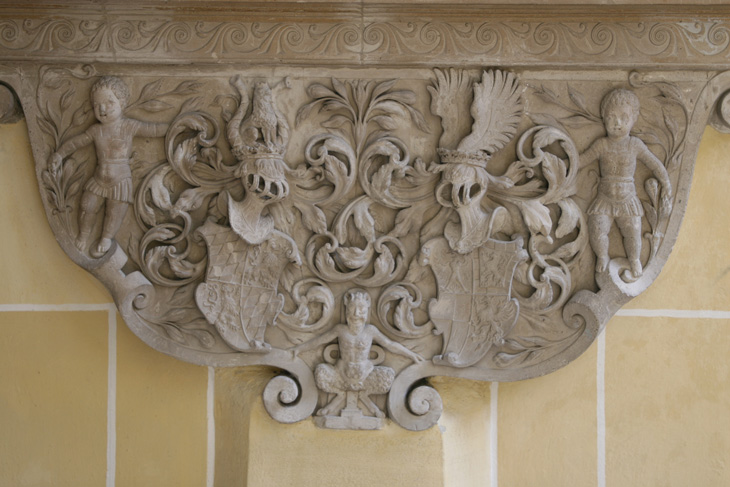 Insgesamt gibt es am Epitaph 10 Wappen, zwei Vollwappen und acht Wappenschilde, erstere für die Eltern und letztere als Ahnenprobe, erstere auf dem Unterhang und letztere in zwei Viergruppen in der Sockelzone und in der Gebälkzone. Beginnen wir mit den Wappen ihrer Eltern: Alberta Pfalzgräfin bei Rhein war die älteste Tochter von (1) Friedrich II. von Pfalz-Simmern (14.2.1515-26.10.1576), der ab 1559 als Friedrich III. Kurfürst von der Pfalz war, und seiner ersten Frau, (2) Markgräfin Maria von Brandenburg-Kulmbach (1519-31.10.1567). Die Beiden hatten 1537 in Crailsheim geheiratet.