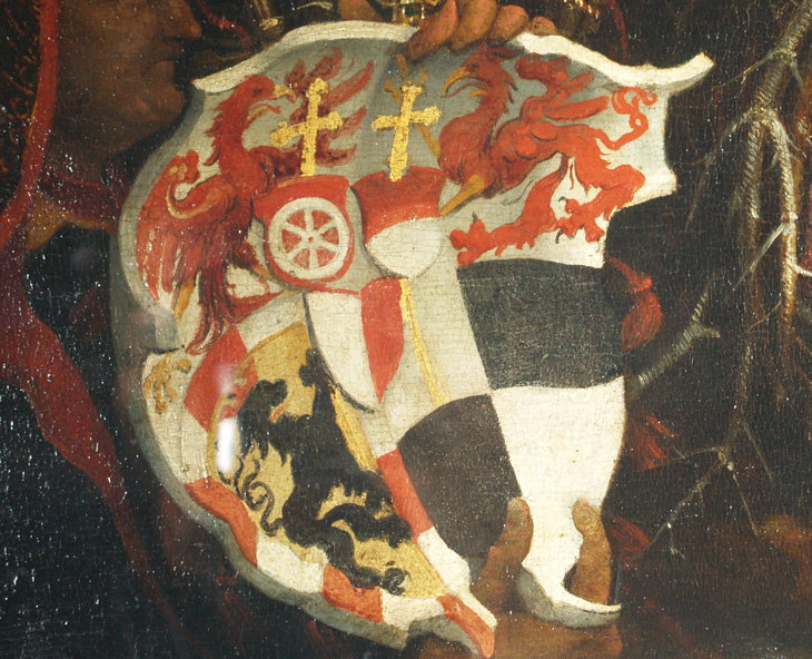 Bildbeispiel: Stiftskirche Aschaffenburg, Gedächtnisanlage für Albrecht von Brandenburg, Einzelwappen für die Grafen von Hohenzollern und das Burggrafentum Nürnberg.