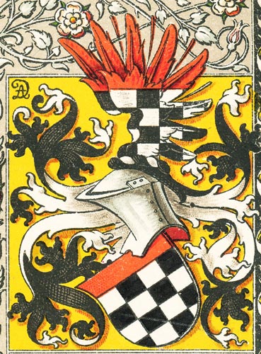 oben das Familienwappen vor leuchtend gelbem Hintergrund, mit der