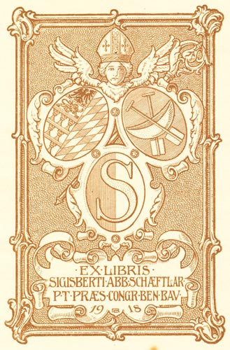 Die Abkürzungen "P T PRAES CONGR BEN BAV" bedeuten Abtpräses der Bayerischen Benediktinerkongregation, ein Leitungs-, Aufsichts- und Repräsentationsamt der Vereinigung grundsätzlich selbständiger bayerischer Benediktinerklöster, welches Sigisbert I. Liebert 1915-1921 innehatte, und in diese Zeit fällt auch das Exlibris. Er war in dieser Funktion der Nachfolger von Gregor Danner von St. Bonifaz und wurde seinerseits 1921 durch Placidus Glogger von St. Stephan abgelöst. Diesem Amt ist die rechte, obere Schildkartusche gewidmet. Sie erhält den Ehrenplatz heraldisch rechts, weil es sich um eine dem Einzelkloster übergeordnete Institution handelt, die am Anfang nach der Wiedergründung in der Mitte des 19. Jh. aus Metten, St. Bonifaz, Andechs und Weltenburg bestand und später um Scheyern, Schäftlarn, St. Stephan, Ottobeuren, Ettal, Plankstetten und im Jahr der Exlibriserstellung noch um Niederaltaich erweitert wurde.