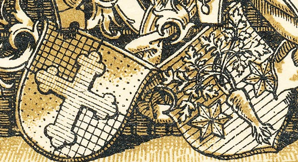 Literaturbeleg). Zwei kleinere Schilde ergänzen die Komposition,