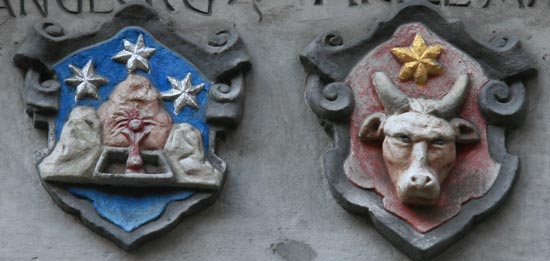 Auf 1615 datierter Wappenstein, optisch links in Blau ein Gebirge mit drei Bergen, überhöht von 3 (1:2) silbernern Sternen, Inschrift JOHAN GEORG BERGER (redendes Wappen mit den Bergen), optisch rechts in Rot ein silberner Stierkopf im Visier, oben begleitet von einem goldenen Stern, Inschrift MICHEL MATHES.