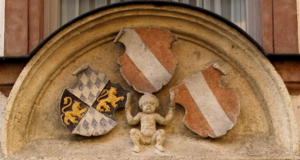 Blick auf den Südwestflügel des Regensburger Bischofshofes aus dem ersten Drittel des 16. Jh., ein schlichter zweigeschossiger Bau, dessen einziger Schmuck zwei Renaissance-Portale sind. Das westliche Portal besitzt ein Rundbogentympanon mit drei Wappenschilden, die um einen hockenden Putten gruppiert sind, der die beiden äußeren, nach innen geneigten Schild mit den erhobenen Händen faßt und den Fuß des dritten Schildes auf seinem Kopf balanciert, ein einzigartiges Ensemble, wo eine einzige Figur zum Schildhalter gleich dreier Wappenschilde wird. Die Inschrift erklärt, daß Pfalzgraf Johann, Herzog von Bayern, Administrator des Bistums Regensburg, diesen Bau begonnen hat, daß ihn aber Bischof Vitus von Fraunberg (1563-1567) 1565 fertiggestellt hat. "R(EVEREN)DISSIMVS AC ILLVSTRISS(IMVS) PRINCEPS D D IOANNES COMES PALAT(INAE) RENI DVX BAVARIAE ECCLESIAE RATISBON(ENSIS) QVODAM ADMINISTRATOR HOC OPVS INCHOAVIT QVOD TADEM R(EVEREN)DISS IN CHRO PR AC D D VITVS A FRAVNBERG EIVSDE ECCL(ES)IAE PERFICI CVRAVIT ANNO D(OMI)NI MDLXV"