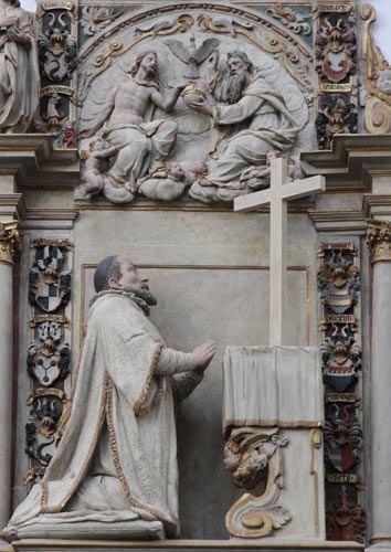 An der Ostwand des nördlichen Querschiffes des Kiliansdomes befindet sich über der Sakristeitür dieses aufwendige Epitaph für Johann Konrad Kottwitz von Aulenbach (-29.12.1610). Sein Klerikerleben begann am 22.2.1561, als er die durch den Tod von Kaspar von Würtzburg freigewordene Dompräbende übernahm. 1574 ging er zu Kapitel. Er war außerdem seit 1562 Domherr in Mainz, wo er 1573 Kapitular wurde. Am 30.4.1584 wurde er Domdechant in Würzburg, 1594 Domcustos in Mainz. Ferner war er Propst des Klosters Wechterswinkel und Propst von Stift Haug in Würzburg und außerdem im Jahr 1580 Landrichter im Herzogtum Franken.