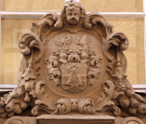 Das Wappen über dem Portal ist geteilt, oben ein doppelköpfiger Adler, zwischen den Köpfen schwebend die Kaiserkrone, unten zwei von einander abgewandte gekrönte Löwen, in den Pranken ein Objekt haltend. Zwei gekrönte Helme: Helm 1 (vorne): ein doppelköpfiger Adler, zwischen den Köpfen schwebend die Kaiserkrone, Helm 2 (hinten): ein wachsender gekrönter Löwe, in den Pranken ein Objekt haltend. Weitere Hinweise willkommen.