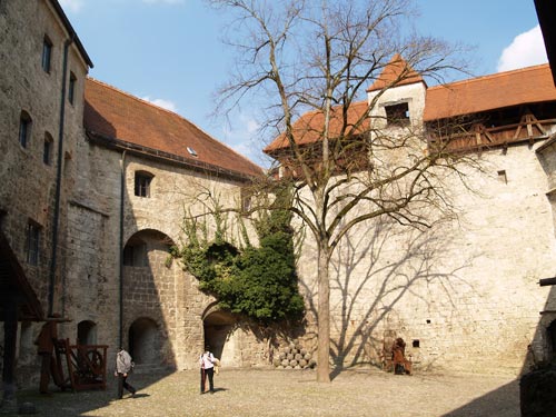 Der innere Burghof wird durch einen Bogen zwiscxhen Dürnitz und Kemenaten in zwei Bereiche geteilt. Der Bogen ist mit den Wappenschilden Bayern (von Silber und Blau schräg geweckt) und Baden (in Gold ein roter Schrägrechtsbalken) bemalt. Datiert ist es auf 1523 - das paßt zeitlich zu Wilhelm IV. Herzog v. Bayern (13.11.1493 - 1550) und seiner Frau Maria Jakobäa v. Baden (25.6.1507 - 16.11.1580).