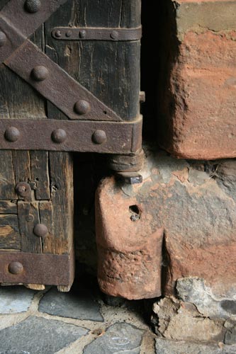 Details des äußeren (ersten) Torhauses. Linke Abb.: die in das größere Tor eingebaute Mannpforte (Schlupfpforte) für Einzelpersonen, im auf 1539 datierten linken Torflügel, rechte Abb.: Widerlager des rechten Torflügels.