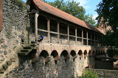 Abb.: Blick auf den nördlich neben dem ersten Tor beginnenden Wehrgang, der den nördlichen Teil der Vorburg dreieckig umschließt, mit Blick auf den Eckturm (Zyngel) und die restaurierten Wehrgänge. Links neben dem Zyngel befindet sich eine spitzbogige Ausfallpforte von 1540 (durch den Unterstand etwas verdeckt im Photo).