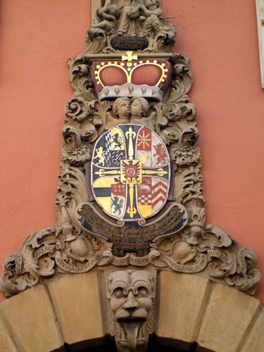 Der Mittelschild enthält ausschließlich geistliche Ämter. Dieser Mittelschild hat sich im Laufe des Lebens entsprechend verändert, er wurde immer den jeweiligen Ämtern angepaßt. Frühe Hochmeisterwappen zeigen im Mittelschild Worms, Ellwangen und Breslau, welches beide unteren Felder einnimmt, wie am Priesterseminar (siehe dort). Als Fürstbischof von Trier rückt Breslau in ein einziges Feld (wie hier), das Prümer Lamm belegt Feld 4. Ein kleiner Herzschild (Ebene 5) noch auf dem Hochmeister-Herzschild zeigt das Trierer rote Kreuz in Silber. 1729 wurde dieses gegen das Mainzer silberne Rad in Rot ausgetauscht (wie hier), dem Ämterwechsel entsprechend. Hier finden wir ein Wappenm das sowohl in seiner Kombination als auch in seinen Inhalten einen Anachronismus darstellt und in keiner Weise zum Umbaujahr 1698 paßt, das inschriftlich belegt ist. Da die Inhalte nur aufgemalt sind und keine Reliefbasis besitzen, war der Fehler leicht begangen.