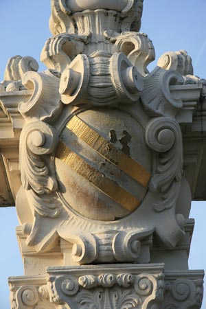 Jeder der Pfosten besitzt auf der Innenseite ein Medaillon mit Portrait des Wappenträgers und auf der Außenseite sein Familienwappen. Es ist nur sein Familienwappen, nicht sein Amtswappen. Die Farbgebung ist keine heraldische, sondern weiß/gold. In der barocken Dekoration treten die heraldischen Farben gerne hinter den im Dekorationskonzept gewünschten Farbschemata zurück. Hier ist es Franz Christoph von Hutten zu Stolzenberg (1743 - 1770), sein Wappen zeigt in Rot zwei goldene Schrägbalken. Die hier nicht abgebildete Helmzier wäre ein offener roter Flug, beiderseits mit zwei goldenen Schrägbalken belegt, sparrenweise gegeneinander gewendet. Die Helmdecken wären rot-golden.