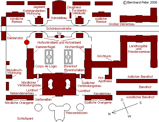 Bruchsal: Übersicht + Konzept - Kammerflügel (1) - Kammerflügel (2) - Corps de logis, Ehrenhof - Kirchenflügel (1) - Kirchenflügel (2) - Schloßkirchturm - Forstamtsgebäude - Kanzleibau - Kommandantenwohnung - Damianstor - Landhospital - Großer Dienerbau - Corps de logis, Gartenseite - Torpfosten - Hofapotheke