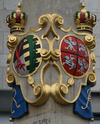 Blick auf die unterschiedlichen Eck-Konstruktionen: Über dem Schriftblock folgt die Wappenzone bzw. das Wappenstück als separat zugehauener Stein, denn hier legte der Landesherr großen Wert auf Repräsentation. Die Darstellung seines Wappens war auch angemessen, denn die Post war ein Regal, das nicht ohne landesherrliche Erlaubnis ausgeübt werden durfte. In der Regel besitzt jede Säule vier Wappen, jeweils die Kombination aus übereck einander zugeneigten barock verzerrten Wappenschildkartuschen mit polnisch-litauischen und kursächsischen Inhalten. Dadurch, daß sich jeweils zwei dieser Kartuschen einander zuneigen und am Eck mit einer Volute miteinander verbinden, überhöht von einer Krone, wird hier der ansonsten quadratische Querschnitt der Säule ins Längliche gezogen.