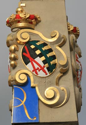 Dadurch, daß sich jeweils zwei dieser Kartuschen einander zuneigen und am Eck mit einer Volute miteinander verbinden, überhöht von einer Krone, wird hier der ansonsten quadratische Querschnitt der Säule ins Längliche gezogen. Da sich beide Schilde einander zuneigen, ergibt sich unter deren Verbindungspunkt eine Zone am Eck, die für die Anbringung von Initialen genutzt wurde: Diese Zone ist blau angestrichen und trägt die verbundenen goldenen Buchstaben AR - Augustus Rex, König August. Das Ganze kommt zweimal an gegenüberliegenden Ecken vor.