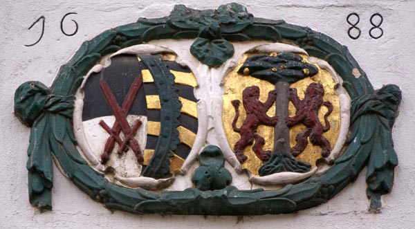 Im Scheitel des Türbogens finden wir das Wappen des Baumeisters. Die Grenzen zwischen verschiedenen Arten von Symbolen werden hier fließend: Die äußere Form ist die eines Wappenschildes, der Inhalt ist eine Marke, seine Baumeistermarke, flankiert von den Buchstaben W und B für Wolf Blechschmidt. Diese Personifizierung entspricht nicht gängiger Praxis für Familienwappen, ist aber typisch für den Grenzbereich aus persönlichem Zeichen und Heraldik, wie wir sie häufig bei frühen Bürgerwappen finden. Das Zeichen selber folgt typischer Aufmachung von Hausmarken einerseits und Baumeistermarken (Steinmetzzeichen) der Renaissance andererseits.