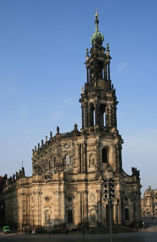 Im Grunde war der Turm ein reines Schmuckelement, denn er war stumm - Glocken wurden aus Rücksicht auf die protestantische Bevölkerung nicht öffentlich geläutet und deshalb auch gar nicht eingebaut. Erst 1806 wurde die Gleichstellung von Katholiken und Protestanten im Königreich verfügt, und 1807 wurden Glocken angeschafft. Seit 1980 ist die katholische Hofkirche die Kathedrale des Bistums Dresden-Meißen, die Kathedrale St. Trinitas, auch wenn fast jeder sie nur "Hofkirche" nennt.