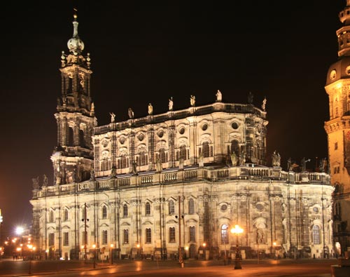 Die Hofkirche ist heute fester Bestandteil des triumphalen Elb-Panoramas und der einzigartigen Kulisse repräsentativer Bauten entlang des Altstadtufers. Doch eigentlich ist sie, obwohl architektonisch integraler Bestandteil des Erlebnisses Dresden, funktional ein absoluter Fremdkörper. Und so sehr wir uns den Wiederaufbau herbeigewünscht haben und uns über das wiedererstandene Bauwerk freuen, so sehr dürfte damals ihr Bau für Befremden gesorgt haben, denn es ist eine römisch-katholische Kirche inmitten des protestantischen Dresdens, der Preis für die polnische Krone des Kurfürsten. Doch insgesamt wurde die Stadt Dresden durch diese grandiose Architektur so wundervoll bestochen, daß die Kirche schon bald vollkommen zum Gesamtbild dazugehörte.