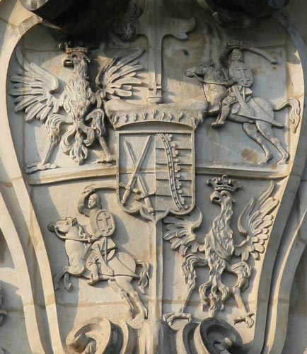 Darüber die polnische Königskrone, gehalten von zwei Putten. Es handelt sich um eine Bügelkrone, die oben mit einer mit einem Kreuz besetzten Kugel abschließt.