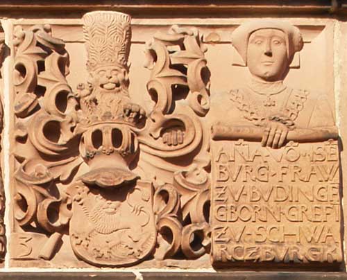 Es handelt sich dabei um das Wappen des Johann von Isenburg Graf zu Büdingen. Interessant, wie die hier sehr statischen Schildhalter - vermutlich Portaits der Bauherren - gleichzeitig mit einer Hand in die Helmdecke greifen und mit der anderen Hand eine Pergamentrolle mit dem Namen des Wappenträgers entrollen.