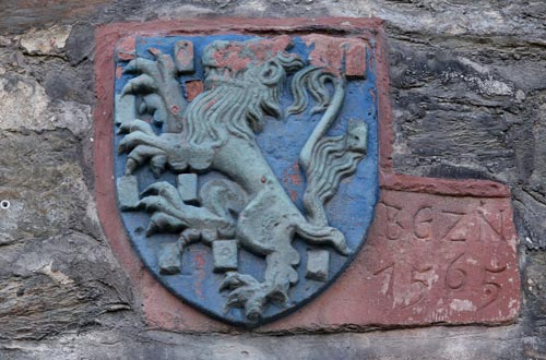 Ein weiteres Nassauer Wappen ist auf 1565 datiert und in den Steinbau der Burg eingelassen. Die Inschrift BGZN steht für Balthasar Graf zu Nassau, eigentlich Graf v. Nassau-Idstein-Wiesbaden (1520 - 11.1.1568), 1564 zu Idstein, 1566 zu Wiesbaden. Er war vermählt mit Margarethe zu Isenburg-Birstein (1542 - 8.8.1612).