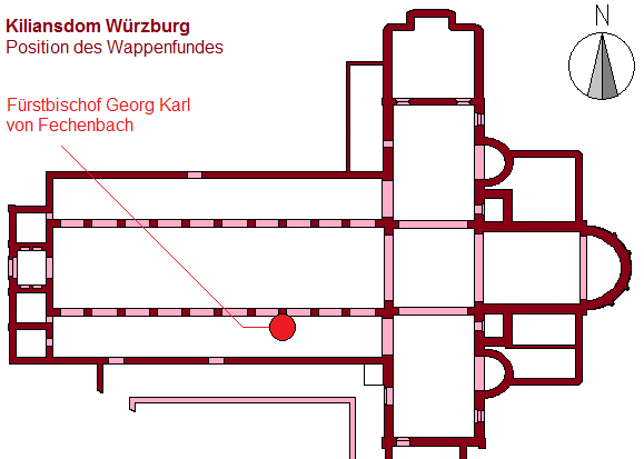 Das Epitaph für den Würzburger Fürstbischof Georg Karl von Fechenbach (lebte 20.2.1749-9.4.1808, amtierte 12.3.1795-9.4.1808) steht im Seitenschiff des Kiliansdomes an der Außenwand. Die Inschrift lautet: "P(OST) M(ORTEM) R(EVERENDISSI)MI AC CEL(EBRISSI)MI PRINCIPIS AC DOMINI BAMB(ERGENSI) ET WIRCEB(URGENSI) EPISCOPI FRAN(CONIAE) O(RIENTALIS) DUCIS D(OMINI) GEORGII CAROLI BARONIBUS DE FECHENBACH IN LAUTENBACH HOC CENOTAPHIUM A(NNO) MDCCCXXV (1825) QUOD NUNC EST CATHEDRALIS HUIUS ECCLESIAE CAPITULUM BONI CURAVIT". Es wurde also erst 1825, lange nach dem Tod des Fürstbischofs, errichtet, als sich die Wogen nach der Säkularisierung und der Umwandlung des Fürstbistums in ein geistliches Bistum etwas geglättet hatten. Das Epitaph ist zeitgemäß schlicht und besteht nur aus Inschrift, Büste und Wappen auf einem ansatzlosen Rundbogenabschluß.