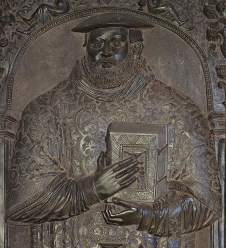 Und noch eine weitere Inschrift kann man entdecken, ganz unten entlang der unteren Kante des Metallplatte. Sie bezieht sich weder auf den einen Domherren noch auf den anderen, sie ist auch in deutscher Sprache abgefaßt und in Minuskeln gesetzt: Es ist die einzeilige, gereimte Fertigungsinschrift des Gießers Straubinger zu Nürnberg, der diesen Metallguß anfertigte: "In der Feuers Hitz / schmelzt man mich mit Witz / das(s) ich lauter flos(s) / Georg Straubinger mich gos(s) / zu Nürnberg fürwa(h)r / Als man za(h)lt 1580 Ja(h)r".