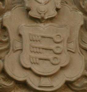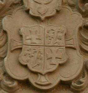 An diesem Doppelwappen ist die trennende Mittellinie besonders interessant gestaltet, oben ein Engelskopf zwischen zwei Flügeln, unten als krasser Gegensatz eine rohe Fratze. Eine Jahreszahl wird nicht genannt. Die Inschrift unter beiden Wappen nennt die Wappenträger: