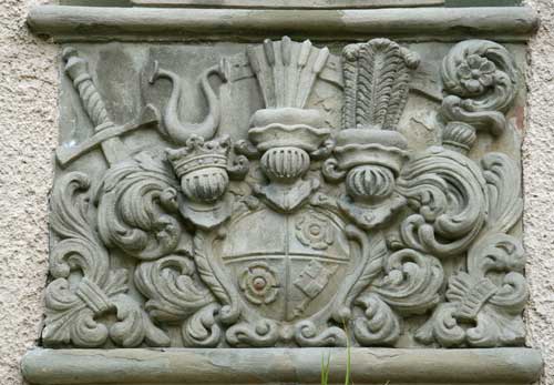 Hier ist das Wappen des Würzburger Fürstbischofs Johann Gottfried von Guttenberg dargestellt. Das Stammwappen derer von Guttenberg findet sich in den Feldern 2 und 3. Es zeigt in Blau eine goldene Rose mit eigentlich doppelter Blattlage und mit goldenem Butzen. Feld 1: "Fränkischer Rechen" = von Rot und Silber mit drei aufsteigenden Spitzen geteilt, Herzogtum zu Franken, Feld 4: "Rennfähnlein" = in Blau eine rot-silbern gevierte, an den beiden senkrechten Seiten je zweimal eingekerbte, schräggestellte Standarte mit goldenem Schaft, Hochstift Würzburg. Drei Helme: Ein Paar Büffelhörner, jeweils im Spitzenschnitt rot-silbern geteilt, Herzogtum zu Franken. Drei Straußenfedern in den Farben Silber, Rot und Blau zwischen zwei rot-silbern gevierten Standarten mit goldenem Schaft, Hochstift Würzburg. In der Mitte befindet sich die Guttenberg-Helmzier - ein niederer hermelingestülpter roter Hut, daraus 5 rotbraune (natürliche) Rohrkolben wachsend. Helmdecken rot-silbern.