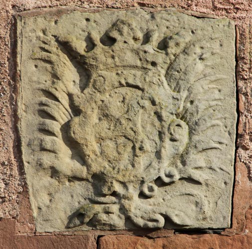 Ein dritter Wappenstein ist ganz links an der Mauer am Anfang der Straße "Große Eulenpfütz" über einer in den Garten führenden Hintertür eingemauert (Abb. unten). Dieses barocke Wappen ist sehr stark beschädigt und zeigt im ungeteilten Schild einen Löwen. Auf dem Schild ruht eine Laubkrone, und der Schild mit eingerollten Kartuschenrändern wird von palmzweigartigem Schmuck eingefaßt. Es handelt sich jedenfalls nicht um ein Eltz-Wappen, vermutlich um ein hier sekundär eingemauertes Warsberg-Wappen.