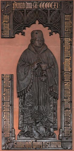 Dieser Grabplattenbeschlag aus Bronze, der heute die Wand eines Seitenschiffes im Würzburger Kiliansdom ziert, erinnert an Albert von Bibra (1464-1511, je nach Quelle auch Albanus oder Albrecht von Bibra genannt). Die Beschläge messen 230 cm in der Höhe und 111 cm in der Breite. Er trat 1483 als Domicellar in Würzburg in die Klerikerlaufbahn ein und schwor am 7.10. auf. 1484 wurde er Pfarrer in Wettringen. Am 16.8.1496 wurde er Propst am Neumünsterstift, und 1502 wurde er Dompropst in Würzburg. Auch in Bamberg war er Domherr (Domkanonikat 1486-1501), und er amtierte noch als Oberpfarrer in Röttingen. Ein weiteres Kanonikat bestand im Liebfrauenstift in Mainz und in der Nikolaus-Vikarie in St. Sebald in Nürnberg. Er verstarb am 24.8.1511. Die umlaufende erhabene Inschrift, von der im optisch oberen linken Teil ein ganzes Stück fehlt, lautet wie folgt: "Anno d(omi)ni M CCCCC XI (1511) die solis vi(g)esi(m)a quarta Augusti obiit Reverend(us) pater Albertus de bibra maioris et sancti Johannis novi monasterii (= Stift Neumünster) herb(ipole)n(sium) eccl(es)iar(um) pr(a)eposi(tus cuius anima requiescat) i(n) s(an)c(t)a pace ame(n)." Die Inschrift ist in gotischen Minuskeln ausgeführt. Innerhalb dieses von der Inschrift gebildeten Rahmens steht das nur an der unteren Seite mit ersterem verbundene Standportrait des Klerikers mit einem Abendmahlskelch in der Linken, in typischer Geste die Rechte mit zwei ausgestreckten Fingern segnend darüber erhoben. Er trägt Chormantel und Birett. Der Raum zwischen Kopf und oberem Abschluß ist mit spätgotischem Sprengwerk gefüllt. Die aus der Nürnberger Vischer-Werkstatt stammende Platte wurde am 16.3.1945 durch Bombentreffer beschädigt.