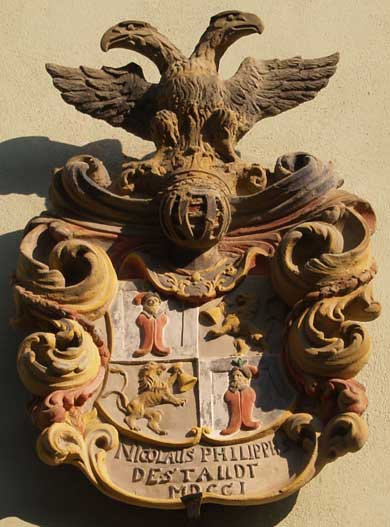 Staudt'sches Haus in der Herrngasse 18, Nicolaus Philipp von Staudt, 1701. Die Familie wurde 1703 geadelt. Ihre Familienwappen tauchen in Rothenburg häufig auf. Der Schild ist geviert, Feld 1 und 4: in Silber ein rotgekleideter Mannesrumpf mit silbernem Kragen, auf dem Kopf eine rote, silberngestulpte Spitzmütze (Stammwappen), Feld 2 und 3: in Blau einwärts ein goldener Löwe, in der rechten Pranke einen gestürzten silbernen Trinkbecher haltend, auf dem gekrönten Helm mit rot-blau-goldenen Decken ein schwarzer Doppeladler. Für die beiden Brüder Nikolaus Philipp und Johann Balthasar Staudt zu Rothenburg, ersterer Mitglied des Inneren Rates, letzterer Lizentiat beider Rechte und Ratskonsulent, wurde von Kaiser Leopold I. am 26.7.1700 zu Wien ein Adelsbrief ausgestellt. Das Wappen wird vorbehaltlich kleinerer Variationen beschrieben im Geschlechterbuch des J. F. Chr. Schrag, im Siebmacher Bay Seite: 117 Tafel: 143; Bg4 Seite: 39 Tafel 46 und bei Schöler, Familienwappen Seite 101 und Tafel 117 Nr. 11. Im Siebmacher Bay Seite 117 werden die Helmdecken als rechts rot-golden (sollen wohl rot-silbern sein), links blau-golden angegeben. Ein weiteres Wappen findet sich am Topplerschlößchen im Taubertal.