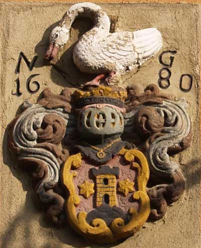 An diesem Gebäude befindet sich über dem Eingang das Wappen der Familie Held, in Rot ein goldener Löwe, auf dem Helm mit schwarz-silbernen Decken ein Flug, rechts schwarz-silbern, links silbern-schwarz geteilt, und dazwischen wachsend ein geharnischter Mann mit Spitzhelm, den rechten Arm abgewinkelt, den linken eingestemmt, in der Rechten nach der Darstellung im Schragschen Geschlechterbuch noch ein Schwert schwingend, welches hier offensichtlich verlorengegangen ist. Weitere Beschreibungen und Abbildungen des Wappens Held finden sich im Siebmacher Band Bg1 Seite: 49 Tafel: 67 und bei Schöler, Familienwappen Seite 56 und Tafel 74 Nr. 2. Bei Siebmacher Bg1 Seite 49 Tafel 67 weichen Beschreibung und Zeichnung voneinander an, laut Text ist der Gerüstete nicht mit Stechhelm, sondern mit Krone ausgestattet, ferner ist nach Beschreibung und Zeichnung der offene Flug schwarz-silbern geteilt, was hier nicht zutrifft.